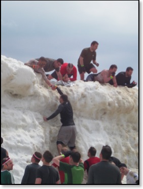 By this time, I was only going on mile 7, and I was 2 hours in. I would have been finished in Jersey by now… Ugh. I knew I was in for it. After Walk the Plank, you run downhill to Glacier which was a tall wall of ice that you needed help to get over. The cold didn’t help much, but like a good Mudder, you had to linger and help fellow Mudders up like you were helped up. Then come the last real, soul-crushing climbs of the day. One is through the Gauntlet, which includes climbs over hay bails while being pelted by snow makers and a deranged man in an executioners mask dousing your cramping legs with a fire hose. Despite the pain, I had to smile. My smile quickly vanished when I saw Cliff Hanger awaiting. It was the steepest climb of the day, and it came at the worse possible time.