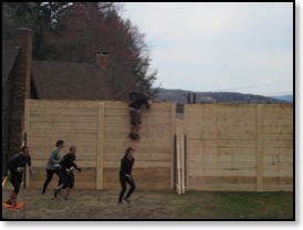After that, it was down the mountain to get dunked in more ice cold water. At least this time there was dye in the water, so if you were blue nobody knew it was because you were freezing. Then it was over the monkey bars, which I successfully cleared this time. They were the only thing I couldn’t do last time, and that pissed me off for the past 5 months. Later I saw people actually walking on top of them to get past. I still can’t decide whether that is horrible cheating or remarkably brilliant. Following those were 4 12’ high walls dubbed the Berlin Walls, which were difficult to get over solo at this point, but I somehow managed.