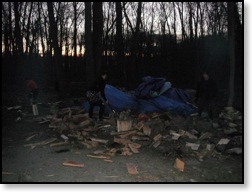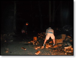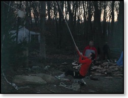 I arrive to the house at around 5:30 or 6:00 am thinking “why the hell do I do these things to myself”. I’m the first one there, so I chit chat a little bit waiting for the rest of the victims to get there. Once most people show, it’s off to the back to start chopping wood. Wood chopping is a sure bet at any Death Race, so it’s good to know what you’re doing with an axe. While we’re chopping wood, they call us one by one over to a rope and pulley hanging from a tree attached to two big concrete blocks. Anybody who’s done a Spartan Race is probably familiar with this particular obstacle.