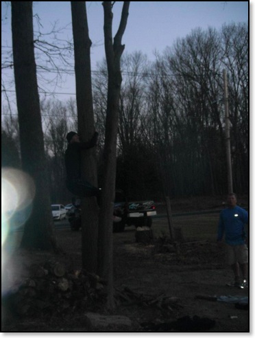 A couple guys went and were able to get 1 or 2… some none. Not happy with this, they got 100 burpees punishment. One of the Tire Guys grabbed the rope and nailed 6. That became the mark you had to reach. My turn came, and I nailed all 6. So ends any exceptional performance by me the rest of the day. The next challenge was to shimmy up a thick branchless tree 3 times. Failure all around except for the guy that was smart enough to bring a ladder. I was able to get up once, which at least knocked my punishment burpees down to 50 or 100. I can’t remember which. All I know is some people were doing A LOT of burpees. After about 2 or 3 hours of this, it was a quick 5 minute break.