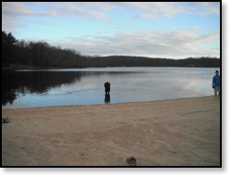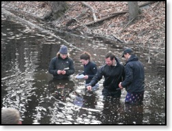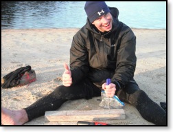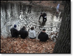 We finally reach a small pond partly covered in ice and are told to walk across it, get a stone and bring it back. Whatever. Easy enough. We make our way across and end up breaking through the ice. The bottom was THICK THICK mud making it easy to lose your balance or a shoe. We all get to the other side, find a big rock, and carry it back trying not to lose our balance. We get there and put the rock down. DONE.