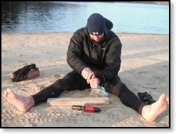 I think I was on my 3rd letter when they noticed my feet. They were in ROUGH shape… stark white and no feeling at all. I was jabbing them with my screw driver to no avail. They thought that could be pre-frostbite, so they told me to go into the truck to warm them up. I still brought my wood with my to finish it. It was getting late at this point. At about 11 hours in, they told everybody to stop and get into dry shoes for the run back to the house; the finish. I excitedly put on my actual running shoes and was determined to stay with the front of the pack. It was the end, so who cares if I tweak an injury? I could suck it up for an hour.
