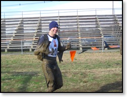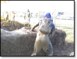 There were muddy hay bales and muddy puddles breaking up Electroshock Therapy. Still together as a team, we went for the approach of diving over the bales instead of trying to hurdle them on the way through. I don’t know if here was a “right” approach because you were getting hit no matter what. I got hit at least 4 or 5 times on my way through. It wasn’t bad, but those socks on the head really can throw you for a loop. After getting through muddier and wetter than when we had gotten there, our run brought us behind the bleachers where the shade instantaneously chilled you to the bone. As if almost on queue, this is where the first aid station with hot chicken broth and snacks was. Everybody, even the vegetarians (something TMHQ may want to think about next year is vegetable broth), grabbed a cup of broth. It was already getting that cold.