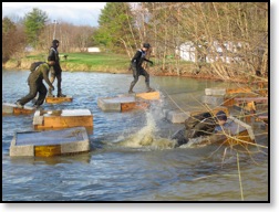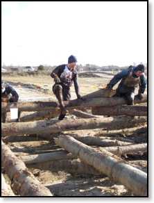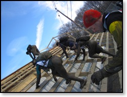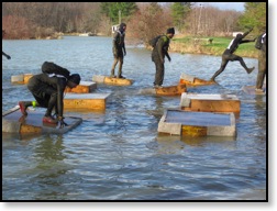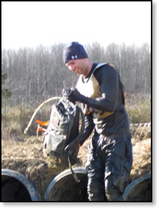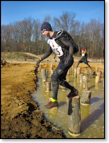 So my hands were frozen and useless at this point making Funky Monkey extremely difficult. I tried using the leg method and failed miserably. The punishment for failing? Take a swim, son, and dunk that head under a board! Not fun. Frigid and freezing I waited for some lagging GRT’s and started making our way through the Creek Crusade and Log Bog Jog. This was basically getting even more wet climbing in and out of trenches and jumping through some logs. This was actually a peaceful part of the course as we ran a nice little trail run to meet the short but unstable “Spider’s Web” cargo net climb. Then emerging from the woods, we were greeted with “Peg Legs”, which was a bunch of stumps sticking up from a pool of muddy water that we had to cross. This wasn’t very difficult at all, but the fear of getting wet yet again added some serious nerves while crossing.