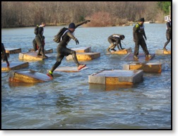 Next up was the well known “Walk the Plank” obstacle where you jump off a high platform into the water. This was followed by another rope aided water crossing to “Hold Your Wood”, where you had to carry a log through the water around set markers. This was actually very short and easy. A lot of the “carry” was through head high water, and well… wood floats. You basically just pushed your log in front of you. After climbing out of the water it was a 1/4 mile – 1/2 run back to the wetsuit tent where you could take your wetsuit off again…