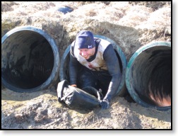 This led into a rather long barbed wire crawl that led up a hill. This was maybe one of the more comfortable parts of the course. I don’t know if it was being so low that we avoided the wind or if it was the fact the ground had been warmed by the sun, but it was gloriously warm. It wasn’t piss in your wetsuit gloriously warm, but it was gloriously warm. That warmth was short-lived however. Next up was the “Boa Constrictor”. The was a small plastic tube angling down into water, so at the end your breathing space was limited. Then you had to crawl back up another tube at the other side. The insides were pretty slick and weren’t that easy to get up.