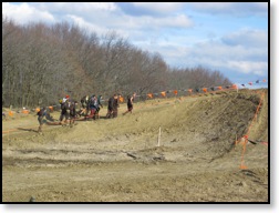 After getting cold, wet, and muddy, it was off to some long stretches of motocross track. Thankfully TM didn’t have the sprinklers on this time around like they did at the Tristate Mudder I did at the same track. The first obstacle hit in this section of track was called “Getting Railed”, and that’s exactly what was about to happen to us. It was maybe 15’ of parallel bars over a water pit. You had to navigate across however you could manage. It wasn’t too bad except my bare hands were already numb and wet, which made it a little harder. After a bit more running, we hit the “Devils Beard” obstacle. This was slightly different than other Mudder inceptions as it went straight up the same steep hill that Cliff Hanger was on during the regular Tough Mudder. I lost my flag patch on my ruck pretty quickly here.