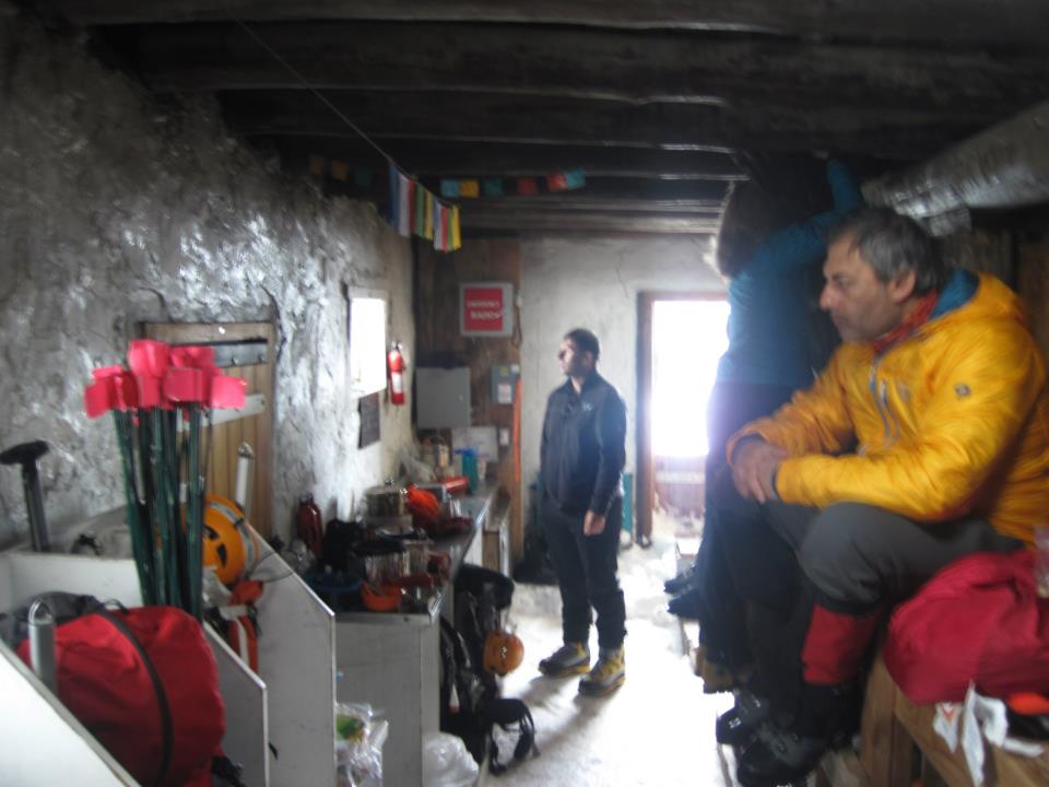 After slogging for a fair amount of time, we started to break through the clouds. Once we did, it was SUNNY and BRIGHT. The rest of the way up to Muir was pretty routine after that. Again, differing fitness levels and experience levels started to show. It was a bit of a test of patience as the pace had to be really slow to keep everybody together. Once to camp, we settled into the shelter which would not remain unoccupied for long as other independent teams made their way up the mountain. We ate dinner in the guide shelter and then headed back to the now bustling shelter. I’m used to hearing bravado and shit talking in different circles for the various activities I pursue and sports I’ve played throughout my life. I’m not sure if it’s the solitary nature of climbing that makes the less than secure feel the need to legitimize themselves, but the talk and posturing rivaled what you’d find in a high school locker room. It was entertaining. We battened down the hatches, and went to sleep getting ready for our foray out onto glaciers the following day.