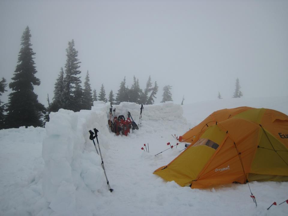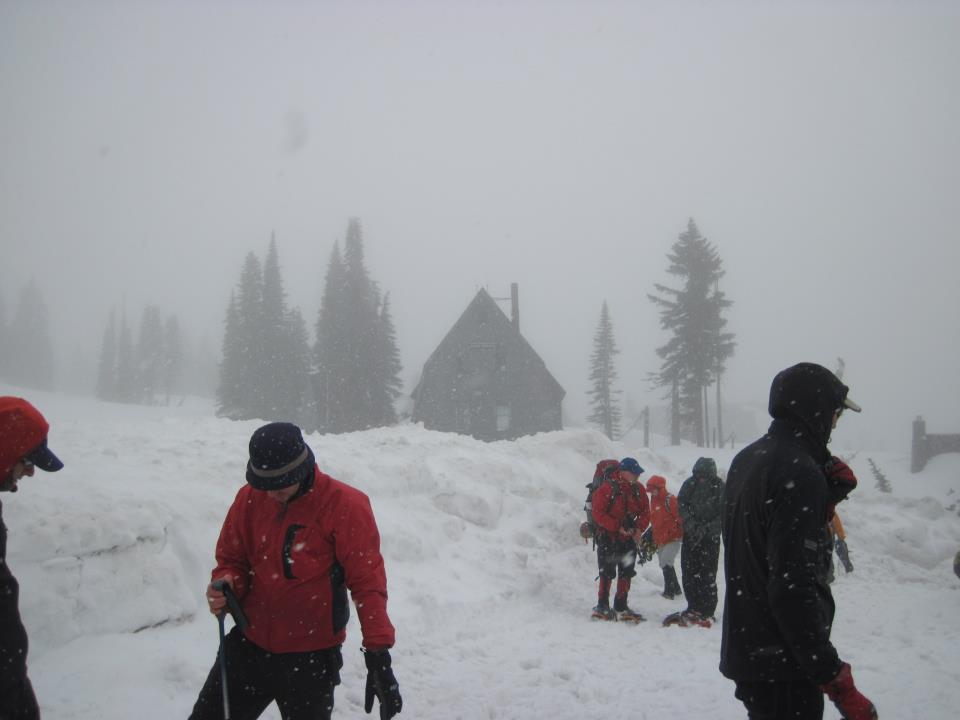 Day 1 – We met at IMG HQ again and fixed the sleds we were to use to drag supplies to camp 1. Once the sleds were fixed, we hopped in the van to head up to Paradise at 5,400′, which was to be the launching point for our little expedition. This was a reality check because it was snowing and blowing at 5,400′. I’m not talking about a little flurry either.