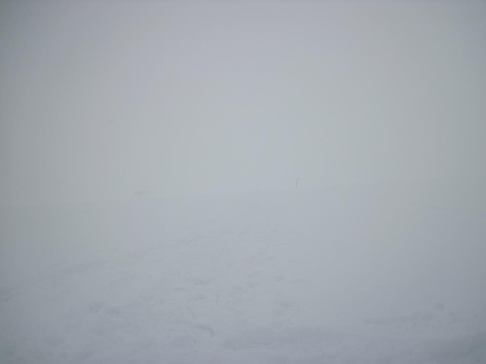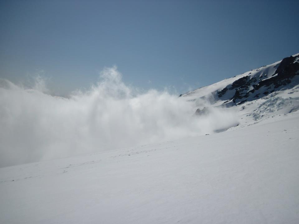 Day 3 – This was a travel day up to Camp Muir at 10,000′. The weather was still snowing and blowing non-stop. It was like being inside a ping-pong ball because everything around you was just featureless white. It was so bad, we walked off a corniced ledge right out of camp.