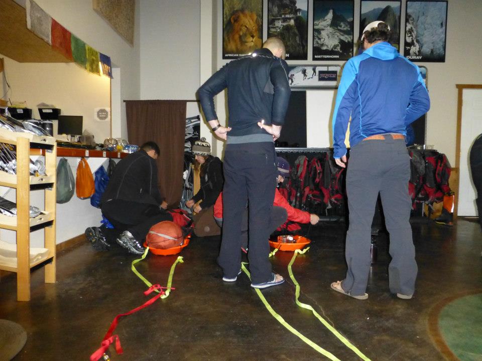 Day 5 – This was to be a summit day, but I’m happy it wasn’t. Instead we started the day doing crevasse rescue. We built off the knowledge of snow anchors we had from the night before and added different “pulley”/haul systems using prussik knots and carabiners. We mainly used the 3:1, which as the name implies means that for every pound of force exerted, three pounds is applied to the object being hauled (eg a 120 lbs person would feel like 40 lbs). Likewise for every foot gained, you chew up three feet of rope. We also learned the 5:1 system, but I believe that was just to demonstrate how to compound the system for easier hauling. We were only tested on the 3:1 system. We split off into 3 person teams. Everybody got a turn as being the haulee, the person to arrest the fall and hold the load (that’s what she said) while the haul system was being built, and the haul system builder.