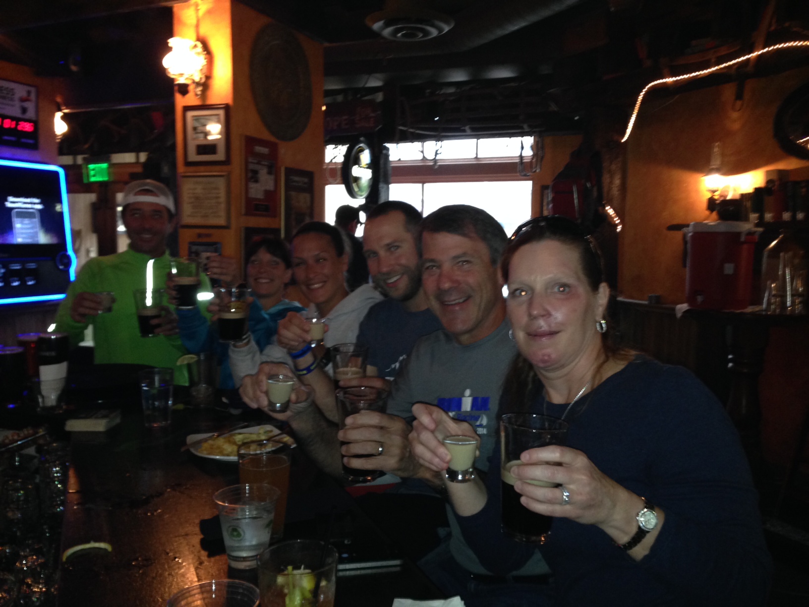 The first of many shots with other disappointed triathletes in the bar at 10am