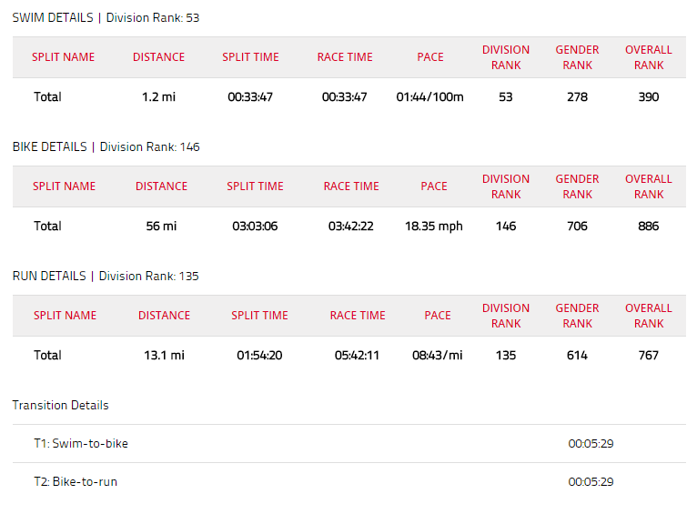 I didn’t make my sub-5:30 goal, but I feel I could have easily nailed it on a better day. I was only 12 minutes away, and that’s time I could have made up on the bike alone.